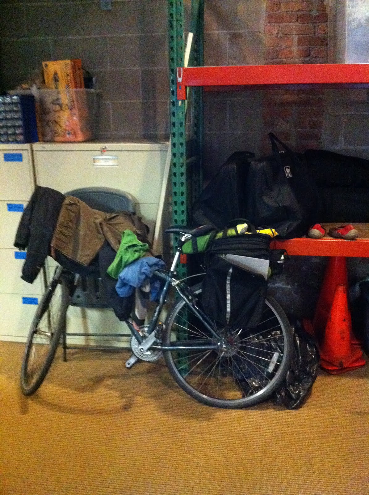 How do you carry your stuff? Paniers? Messenger bag? Milk Crate? I’ve tried all three, but these days I’ve got a trunk bag that has attached paniers. It has a huge capacity (key since I commute between jobs, bring a change of clothes, and pack my lunch), and I like not having to carry anything on my back. Downside: it’s heavy. I’ll add, too, that the homeless people who like to steal bikes noticed me a LOT less when I was rocking the orange milk crate.