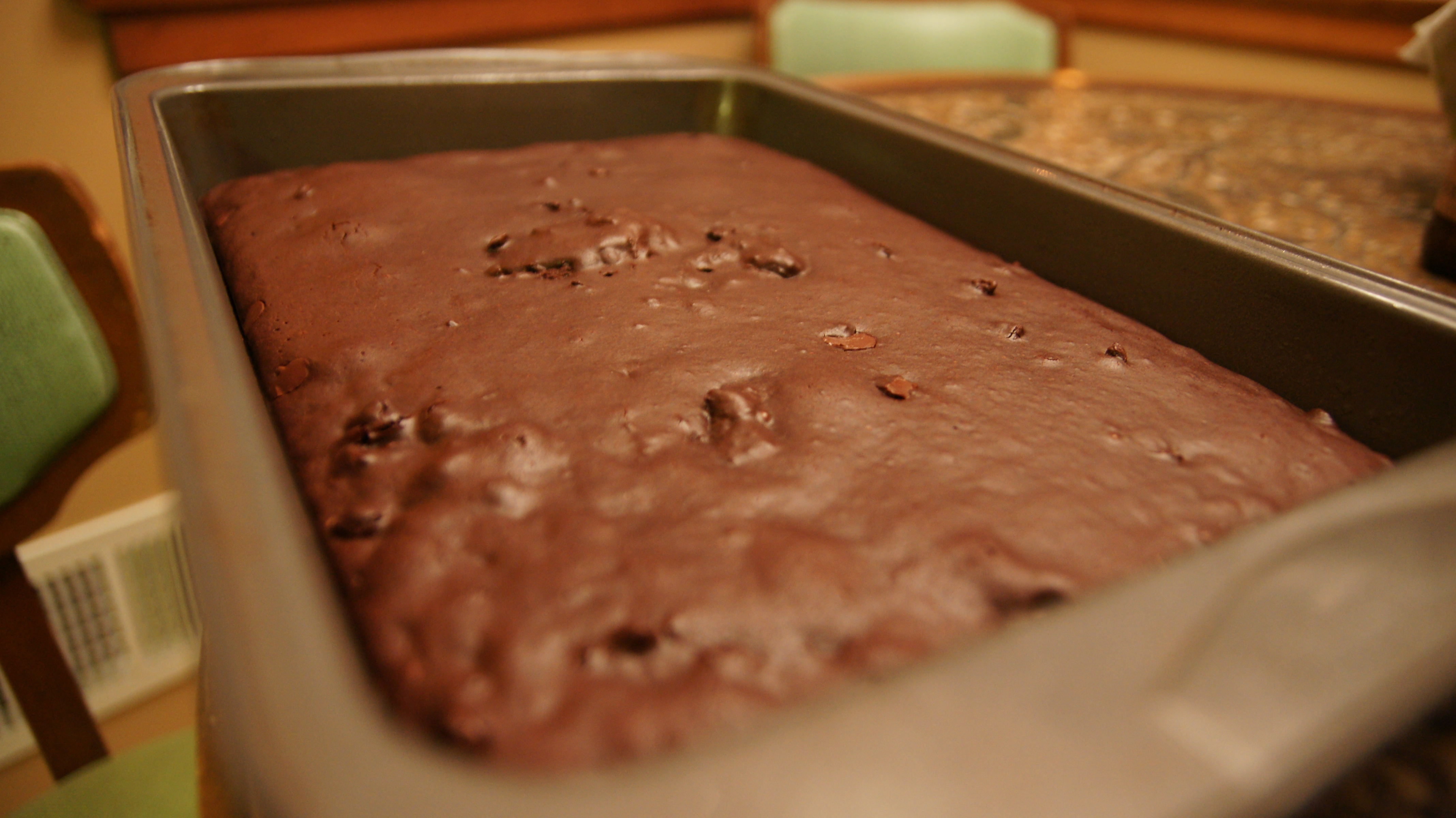 Melt butter and baking chocolate together in a double boiler over low heat, stirring constantly until completely melted. You can use a regular pot, just monitor very carefully to make sure the mixture doesn’t burn. to the bottom of the pan. Remove from heat.