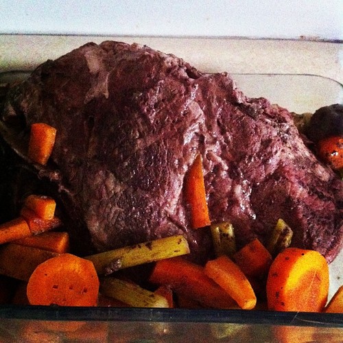 I’m all about multi-tasking, and what better way to multi-task than to cook dinner for tomorrow while you’re sleeping! So, instead of the aforementioned 15 minutes of Project Runway I threw the typical meat-veg-liquid combination in the slow cooker and this morning I’m greeted by this: