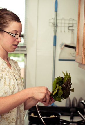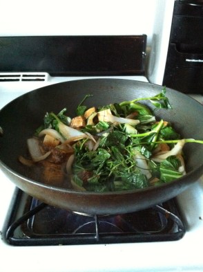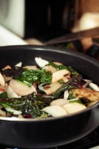 Meanwhile, separate the leaves of the chard from the woody stem and chop the stems. Add chard stems, onions, and turnips to the pan and cook another 2-4 minutes. Add the spinach and chard leaves by the handful, and mix until the greens become dark and wilty.