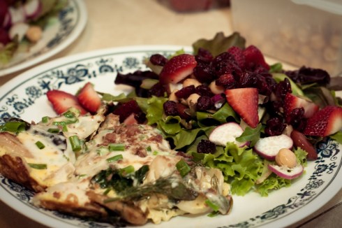 I served this gorgeous thing with a side salad of spring mix, kidney and garbanzo beans, strawberries, sunflower seeds, leftover radishes and dried cranberries. That, and about a bottle of red wine….