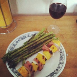 My favorite meal of the week has to be the grilled asparagus with black forest ham and pinapple skewers. Ok, so I know pineapple didn’t exactly come from a farm in North Central Illinois….. In my defense I bought it a week ago before I got my first box and it was on its last leg. The whole package deal of this meal, combined with my first time grilling and a glass of Cabernet made for a lovely, lovely dinner.