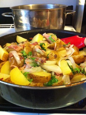 I used the potatoes to make a German Potato Salad with some leftover bacon, and substituted fresh arugula from my friend Ann’s garden in place of parsley. I discovered about three days ago that it’s really delicious for breakfast with melted cheese on top.
